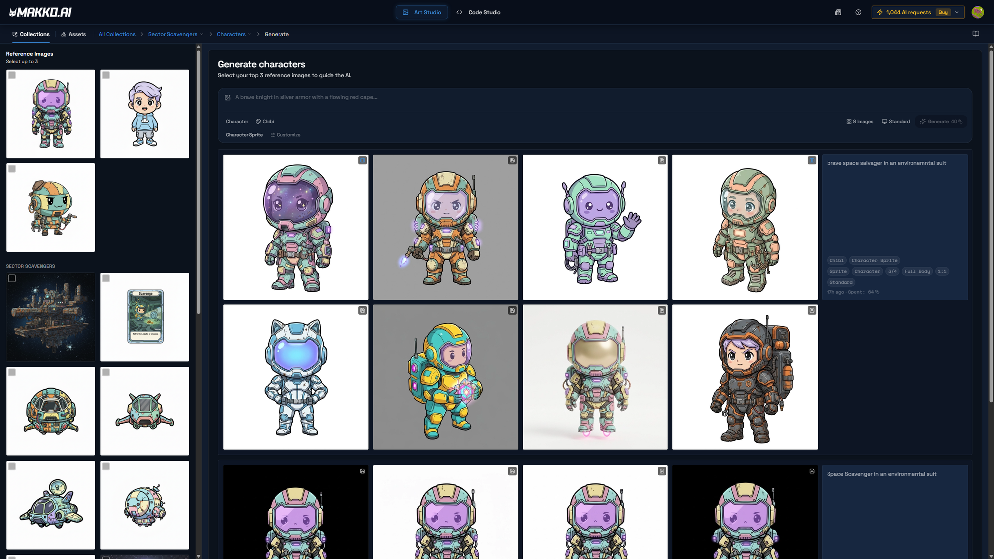 For Sector Scavengers, prompts like "brave space salvager in an environmental suit" and "space scavenger in an environmental suit" produced a full grid of variations in a single generation pass: different armor configurations, color combinations, and facial expressions, all consistent with the established chibi sci-fi style. Selecting the right reference images before generating kept each new character visually connected to the ones already in the collection.