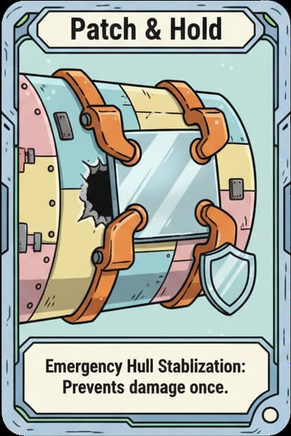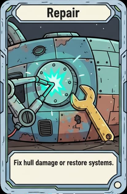 Repair restores 10 or more hull and reduces collapse risk by 10% per use. Three repair cards in a run allow the derelict to persist and become a candidate for upgrade and future habitation. There is a 35% chance of hull stress that deals 25 damage, so even the sustain card can bite back. It is essential for long runs.