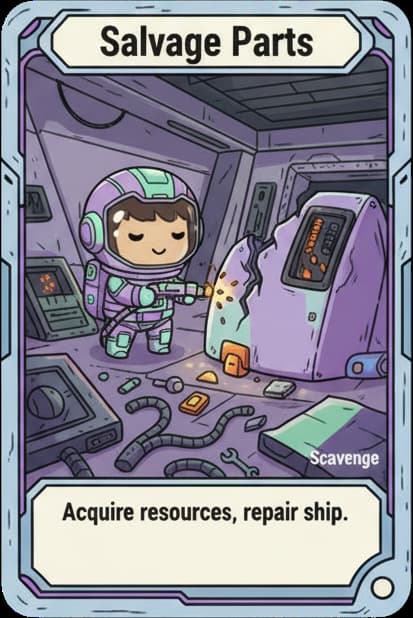 Salvage Parts kicks off a Scavenge loot and damage roll and applies one charge of repair, giving players the ability to search for salvage and repair the ship in a single card play. The design question: how do players use and enjoy dual-use cards? Are they overpowered? Will scarcity need to be applied during the draw? Playtesting will answer that.