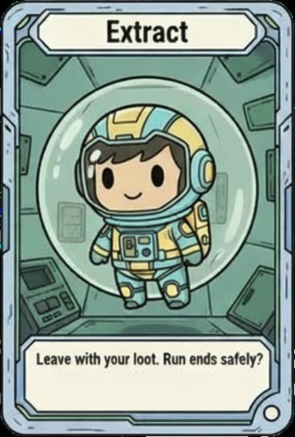 Extract is the tension card. It costs only 5 energy but the later you play it in the run the more likely a breach becomes on your way out. The question it forces every round: extract now and bank your rewards, or scavenge one more time?