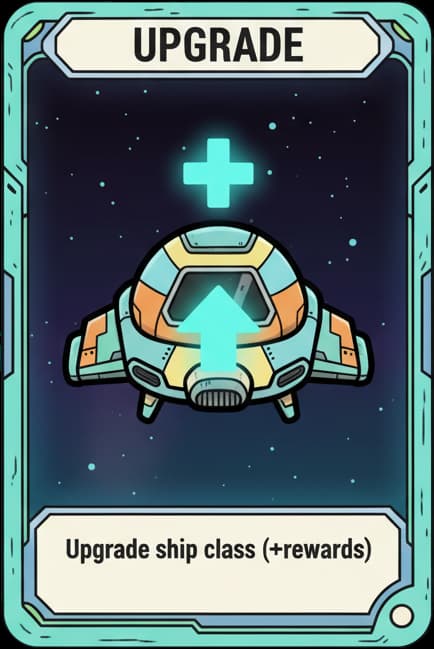 Upgrade costs 20 energy and bumps the target ship's class by 1. Higher class means better loot and reduced breach chance. It is a long-term payoff card that rewards players who think several rounds ahead.