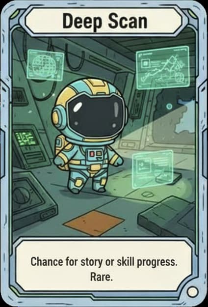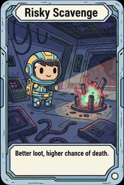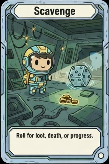 Scavenge is the base risk and reward card. There is a 30% chance of valuable salvage with ship class boosting rarity, 20% chance of nothing, and a 50% chance of entering a danger zone where breach chance scales by round. Higher ship class means better loot and higher breach chance. The card and the environment define the loop together: push your luck or play it safe.