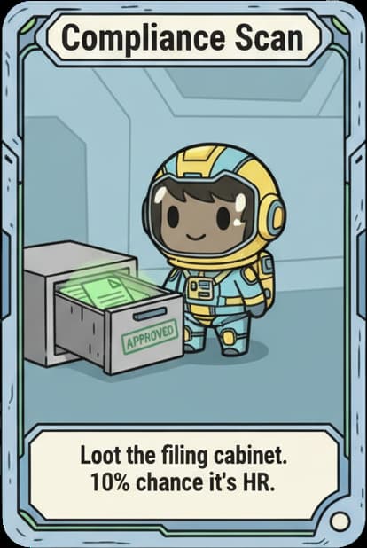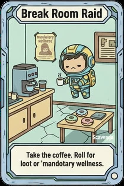 Art variants are cards with different art and descriptions but identical mechanics. Compliance Scan and Break Room Raid are both Scavenge cards with cosmetic differences only. They test whether players value visual variety. Gameplay variants like Risky Scavenge, Rush Scavenge, Full Haul, and Deep Scan are mechanically distinct and change how a run plays out.