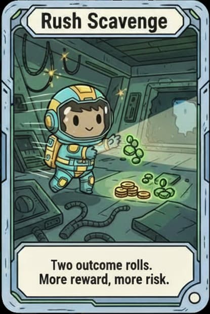 Rush Scavenge increases hull breach risk for double rewards. The design question: do players prefer more rewards or better rewards? Both variants exist so playtesting can answer that directly.