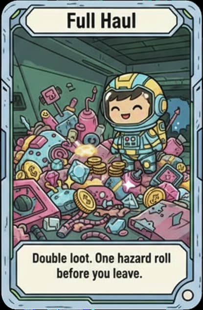 Full Haul doubles your loot but triggers a hazard roll regardless of how you extract. It is the most mechanically complex of the Scavenge variants and raises an honest design question: is asking the player to remember they applied a debuff to their extract too much cognitive overhead? Playtesting will tell us.