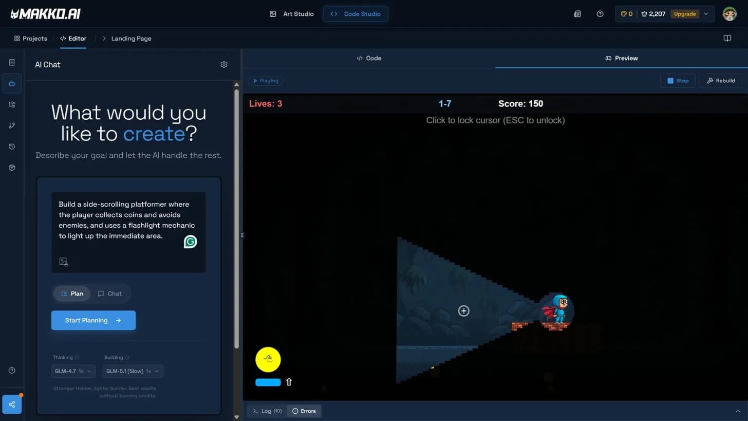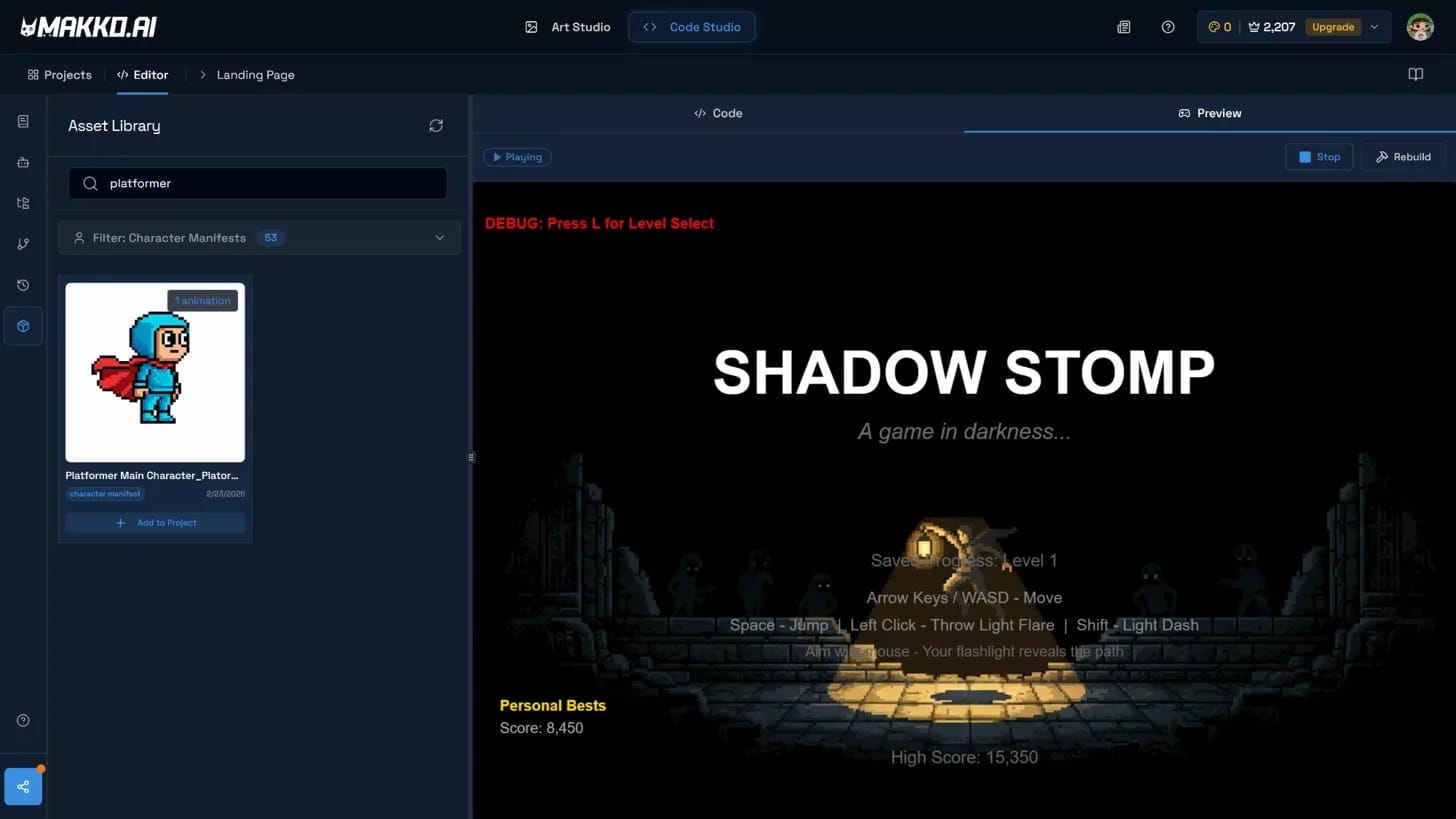 Yes. Makko covers both art production and game logic. Art Studio generates characters, backgrounds, and animations from text descriptions. Code Studio turns those assets into a playable game using natural language instead of code. The result is a complete 2D game built entirely through creative direction rather than technical implementation.