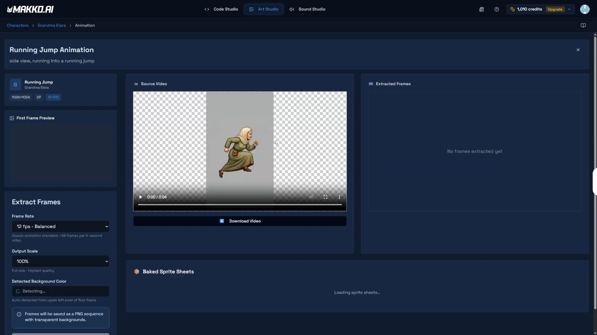 - Extract frames and clean every animation in the Animation Studio. Remove standing frames, loop stutters, and transition poses that do not belong in the loop. Do not create a sprite sheet from an uncleaned animation.