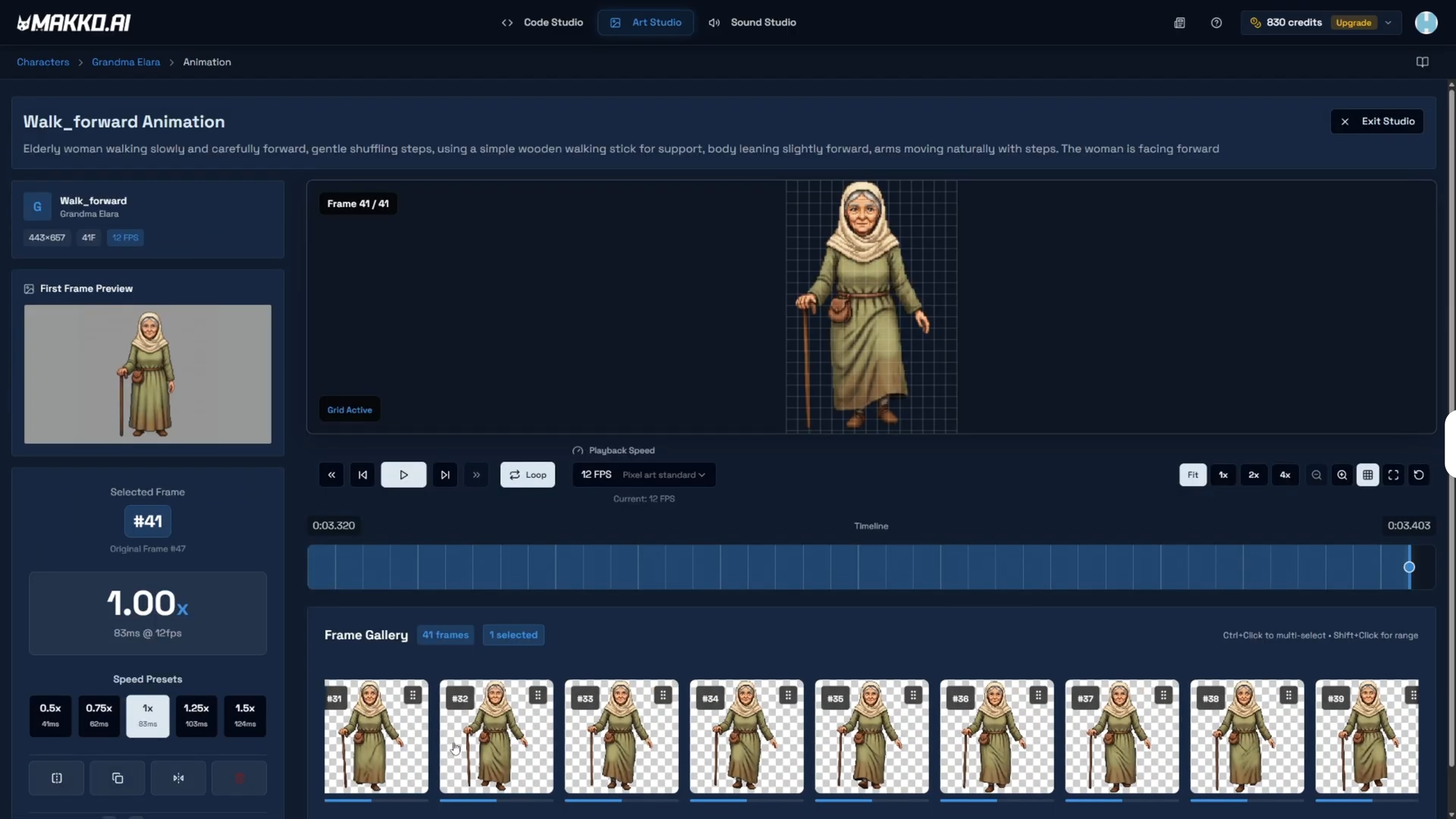 Open the base character's details page in Art Studio. Every animation in this workflow follows the same sequence: choose a frame rate, extract frames, open the Animation Studio, clean the frames, create a sprite sheet.