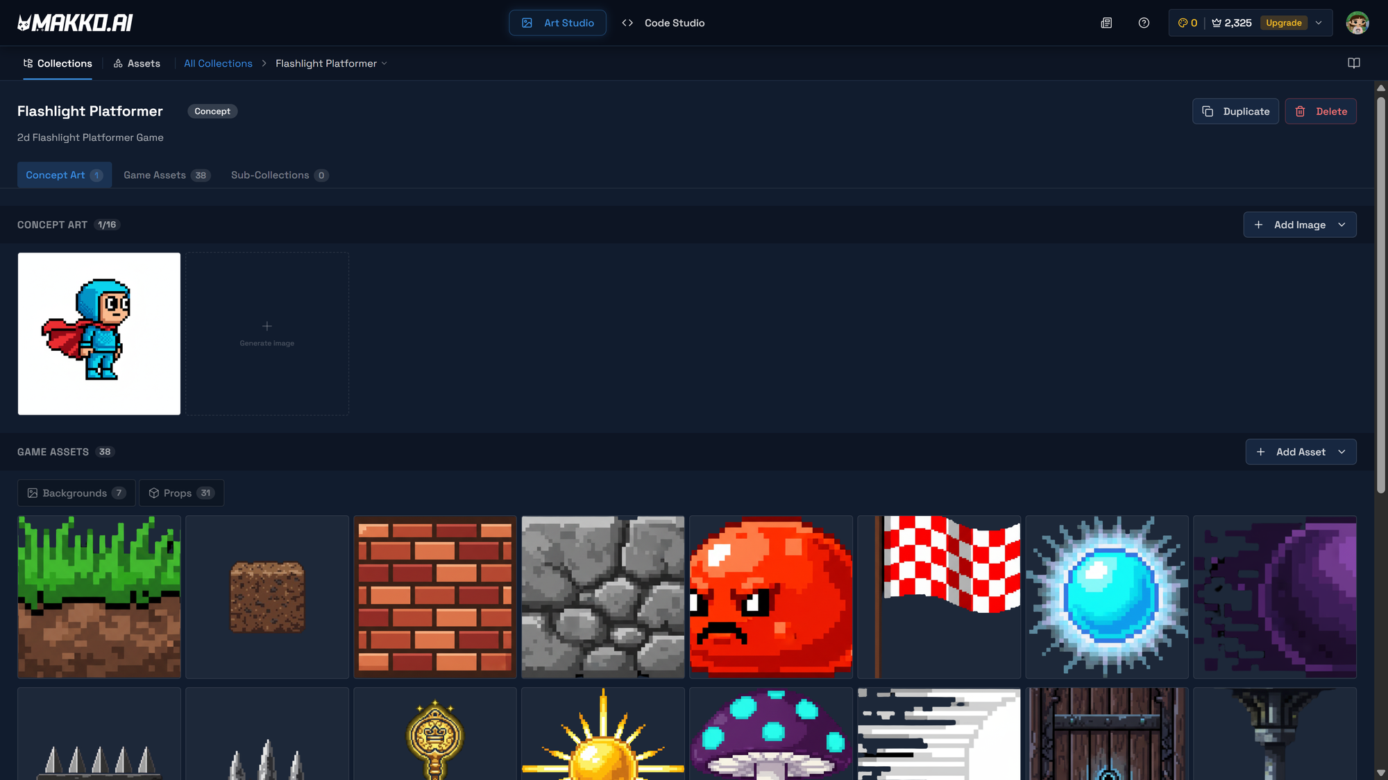 Makko is built around the idea that making a 2D game should start with the art, not the code. The workflow begins in Art Studio, where you create a Collection, a project container for your game's entire visual world. You give it a name, set an art style, and build out concept art that establishes the visual direction. That concept art then serves as reference guidance for every asset you generate afterward, so the AI has a consistent visual anchor to work from each time.